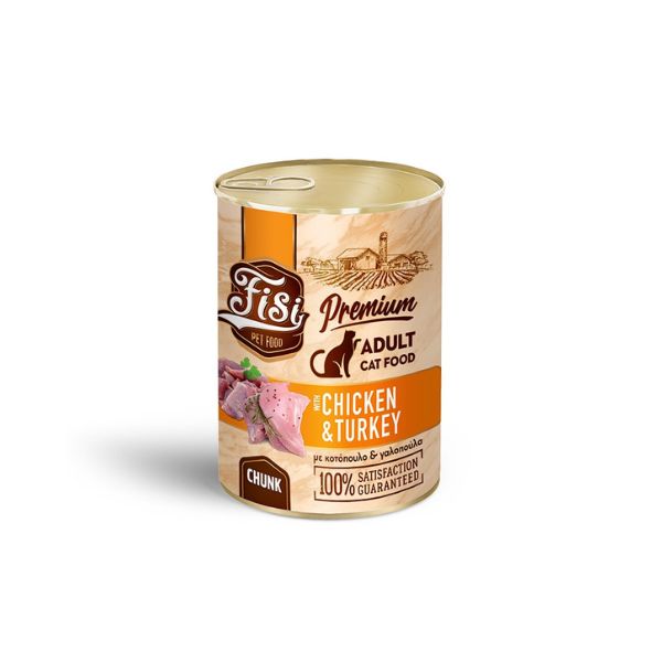 FISI CAT ADULT CHUNKS ΚΟΝΣΕΡΒΑ ΓΑΤΑΣ ΜΕ ΚΟΤΟΠΟΥΛΟ & ΓΑΛΟΠΟΥΛΑ ΣΕ ΣΑΛΤΣΑ 400gr