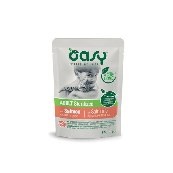 Όλη η σειρά OASY είναι κατάλληλη για καθημερινή διατροφή, περιέχει 40% φρέσκο κρέας και είναι διαμορφωμένη σύμφωνα με τις ιδιαίτερες ανάγκες, την ηλικία και τις προτιμήσεις της γάτας σας. Η OASY δεν περιέχει τεχνητά αρώματα ή χρώμματα και προσφέρει πολλά διατροφικά οφέλη λόγω της απόλυτα φυσικής σύνθεσης της. Πλήρης τροφή για στειρωμένες γάτες.