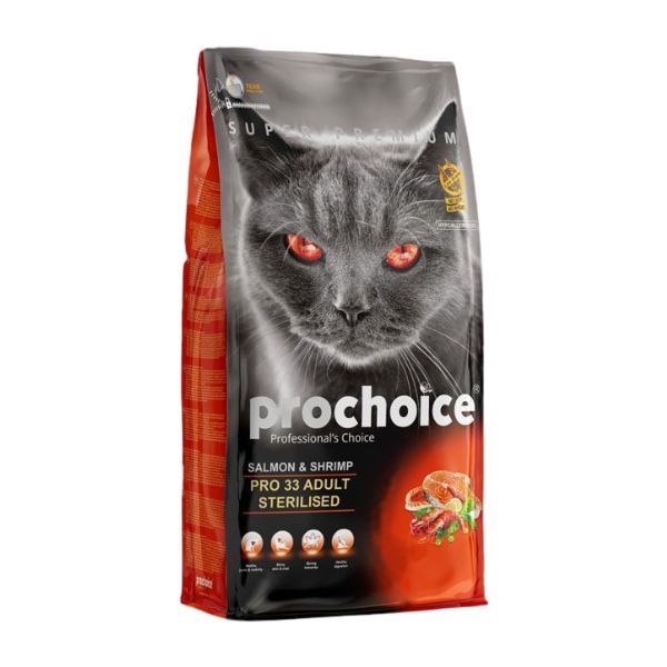 Η ProChoice 33 Adult Sterilised με Σολομό και Γαρίδες είναι μία πλήρης και ισορροπημένη διατροφή για στειρωμένες γάτες ηλικίας άνω του 1 έτους.